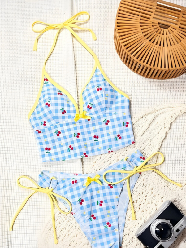 Flirty & Fun Retro Summer: Vintage inspire blue gingham & cherry two piece bikini