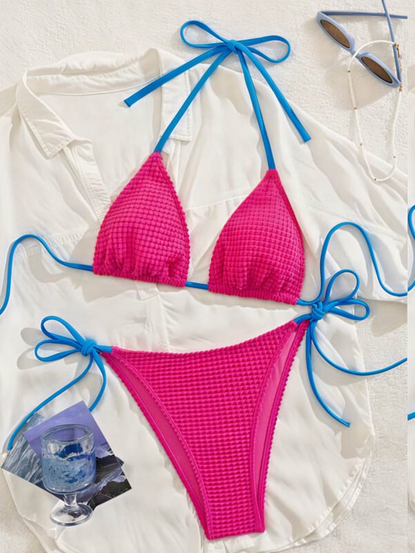 Pink Wave Textured Triangle Bikini – Blue Tie Accent Swim Set