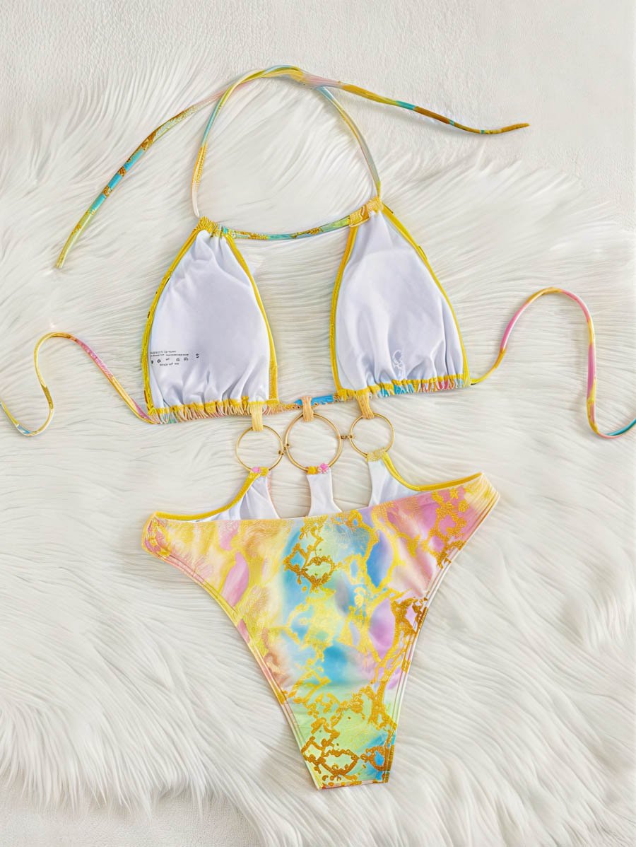 Make a bold entrance in this multicolor ring‑linked monokini, designed for luxe resort escapes and sun‑kissed beach days. Featuring a halter neckline, triple gold‑ring connectors, and a sculpted silhouette that flatters every curve, this statement piece blends high‑end glamour with playful tropical energy.