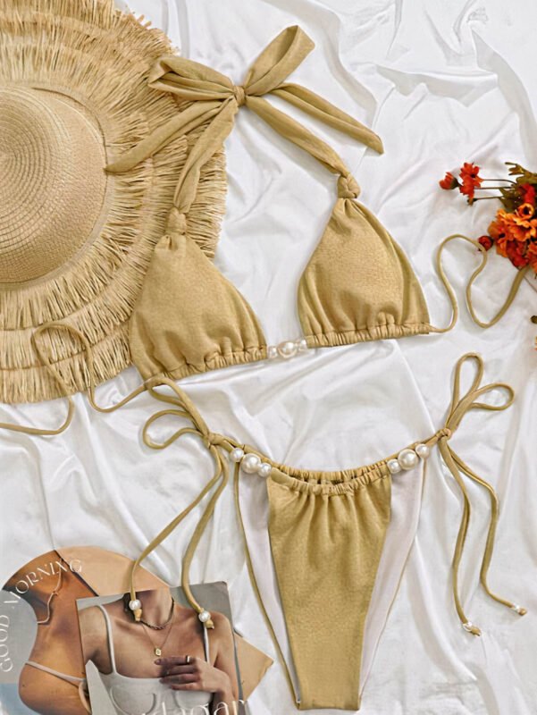 Pink Beaded Peplum Halter Bikini Set – Ruffle Tie‑Side Swim